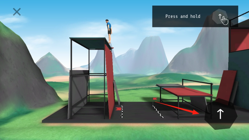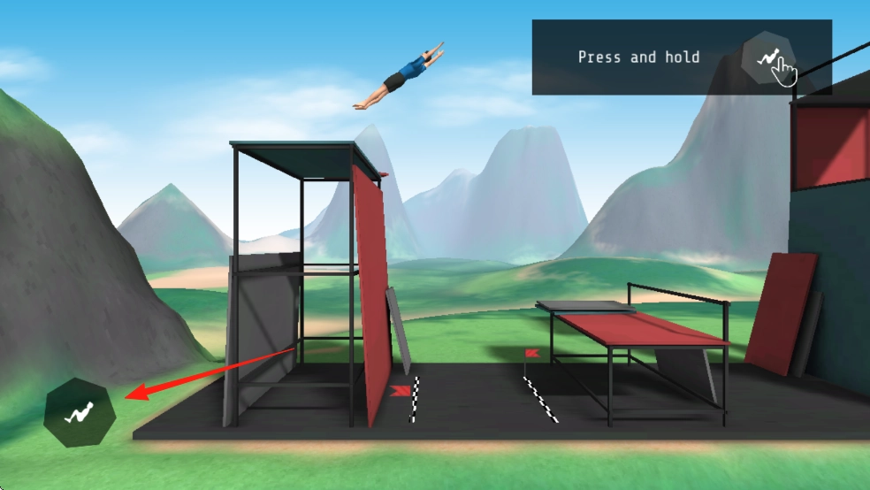 1、在高台处,长按右侧标有“Pressandhold”的按钮(红箭头所指位置),进行蓄力以准备跳跃。
