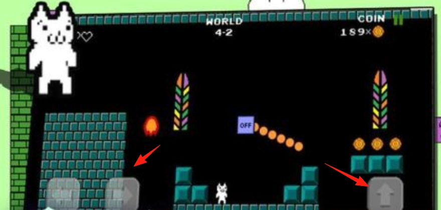 1、在WORLD4-2场景中,通过按左箭头键控制角色移动,途中会遇到火焰陷阱,需等待“OFF”状态下机关关闭后,再按右箭头键跳上台阶。