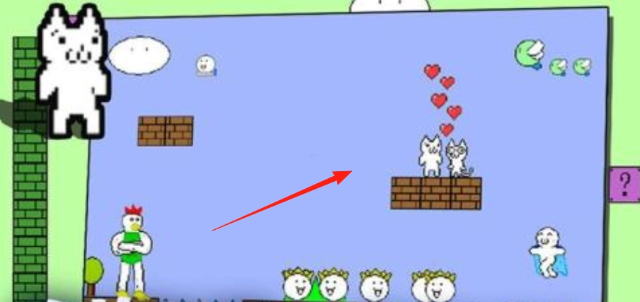2、进入特殊场景后,沿着红色箭头的指示寻找隐藏路径,在此过程中注意避开鸡哥和云朵怪,一路前行直至抵达猫咪情侣所在的位置,随后触发剧情。