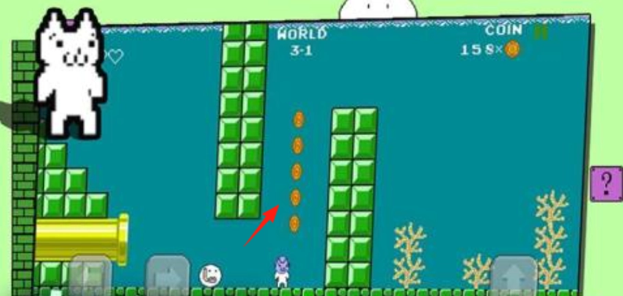 3、前往WORLD3-1关卡,按照红箭头所指的方向前进,通过跳跃绿色方块移动,注意避开水下的金币陷阱,最后从黄色水管进入新的区域。