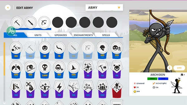 根据自己的喜好选择不同类型的火柴人兵种,用于组建自己的战斗阵容。