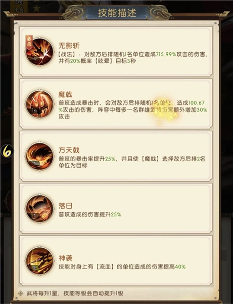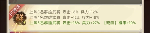 3.阵容加成:当队伍里群雄武将数量多于3名时,每额外上阵一名群雄武将,都能为全队提升攻击与兵力;若上阵满5名群雄武将,还可进一步提高流血触发概率。