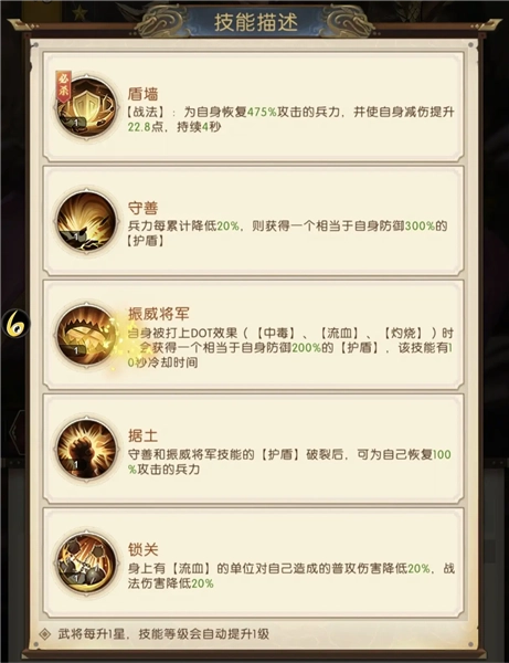 刘璋是一位自带护盾减伤效果的前排角色,他的必杀技“盾墙”能够为自身恢复大量兵力,并且在接下来的一段时间内持续提供减伤效果。其一星被动技能“守善”,会在自身兵力降低到一定程度时,生成一个基于自身防御属性的护盾;而三星被动技能“振威将军”,则是在自身处于负面状态时获得一个护盾,不过这个护盾的数值略低于“守善”所提供的护盾。