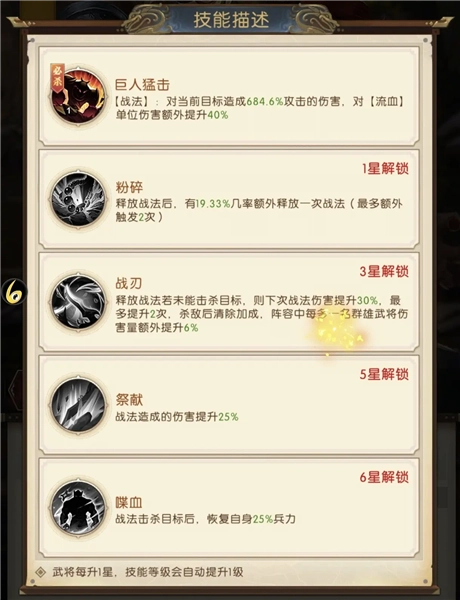 华雄是一位具备高额输出能力的前排角色。他的必杀技“巨人猛击”能够对正前方目标造成巨额伤害,且对处于流血状态的单位会额外提升伤害量。一星被动技能“粉碎”,让他在释放必杀后有概率再次释放一次,该效果最多可触发两次。三星被动技能“战刃”则规定,若必杀未成功击杀目标,将提高下一次必杀的伤害,此加成最多叠加两次。