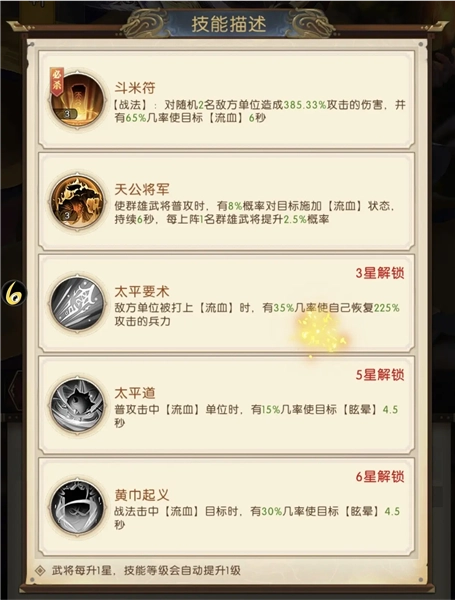 张角定位为流血辅助型角色,其必杀技“斗米符”有概率对敌方两个单位附加流血状态;一星被动“天公将军”可使队伍里的群雄武将在普攻时,有概率给敌方单位上流血状态,且队伍中每多一名群雄武将,该概率还会相应提升;而五星被动“太平道”与六星被动“黄巾起义”的效果是,当张角用普攻或必杀命中带有流血状态的目标时,有概率触发眩晕效果。