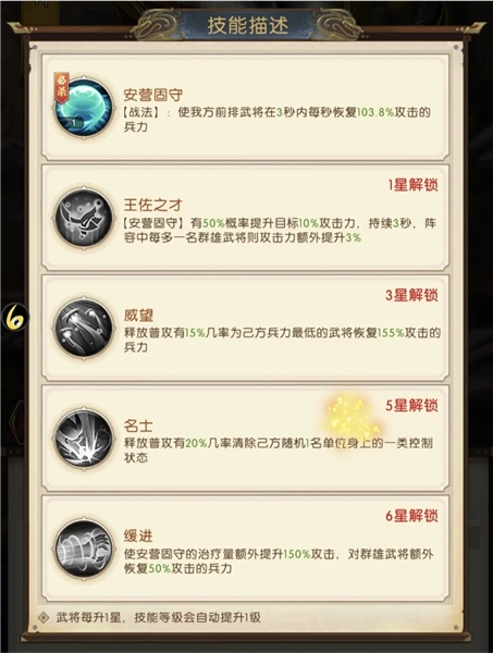 沮授是一名治疗增幅型辅助角色。他的必杀技“安营固守”能为前排武将恢复一定兵力;一星被动“王佐之才”在释放必杀时,有概率提升目标的攻击力,且我方每多一名群雄武将,还会为目标额外增加攻击力;五星被动“名士”则让他在普攻时,有几率为队伍中的一名单位清除一种负面效果。