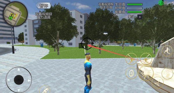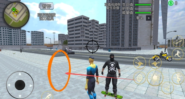 1、通过虚拟摇杆操控角色移动,点击右侧的绳索技能按钮即可发射绳索,钩住高楼后就能实现空中穿梭,从而快速遍历城市的各个角落。