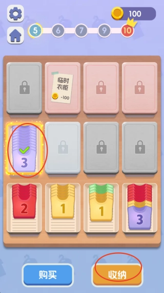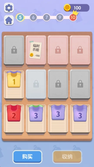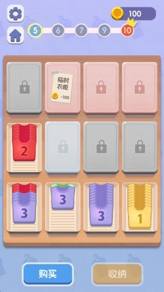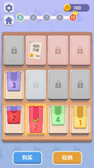 1、进入游戏后,通过点击并拖拽操作,把数字相同的衣物放到同一个收纳格里,等收纳格集满后就能点击购买新衣物了。