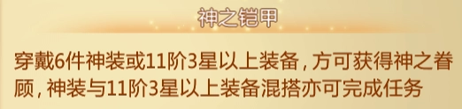 2、神之铠甲:角色身着的装备需满足6件神装,或者11阶3星及以上装备的条件。