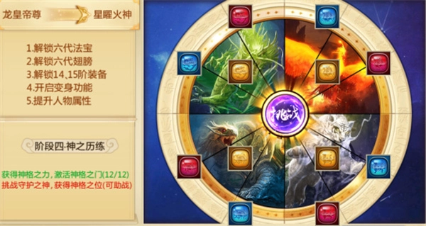 4、神之历练:可通过四种钥匙(击杀500级以上BOSS掉落、商店购买或使用元宝代替),或是巅峰230级以上的经验来激活对应的神格。待所有神格全部激活后,点击“挑战”按钮即可开启封神副本挑战,挑战胜利且角色等级达到巅峰250级以上,就能完成转职。