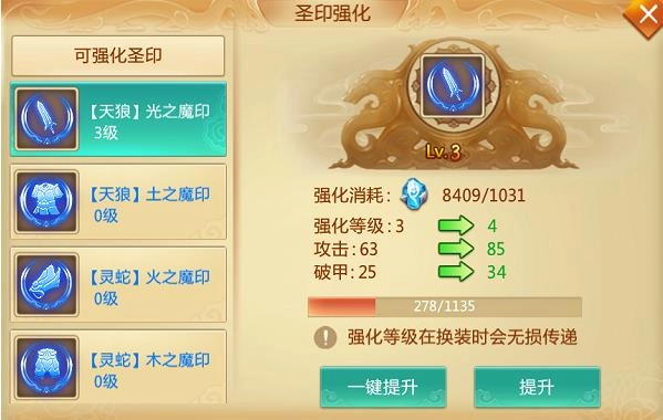圣印强化需要消耗五行晶魄,每次强化会增加一定的熟练度,当熟练度积满时强化等级便会提升。圣印的强化上限由其自身阶级决定,不同阶级对应不同的上限;同时,圣印不同部位的强化所带来的属性加成也各不相同。需要注意的是,强化仅对圣印的基础属性生效,五行属性不会通过强化得到提升。