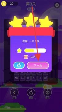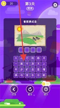进入关卡后,仔细观察图片中的线索,从下方的字库中挑选合适的汉字,将它们组合成与线索对应的成语(例如“一日千里”)。