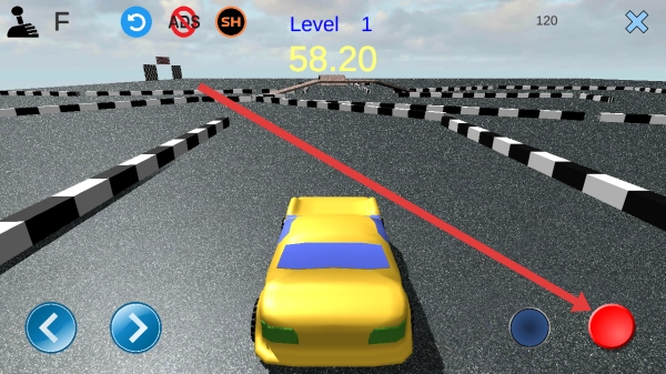 驾驶黄色赛车时,需点击右下角红色按钮进行加速,操控车辆沿赛道起步,开启Level1挑战。