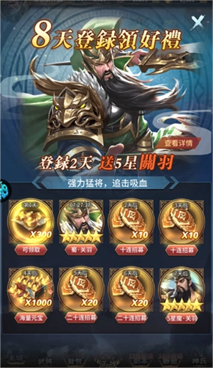 3、累计登录8天还可以领取魔关羽。
