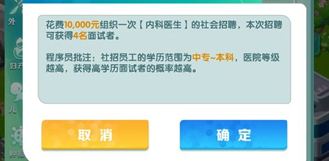 (2)名校招聘的方式其实更适合医院发展早期采用,原因在于医院等级越高,通过名校招聘所需的费用也会相应增加。我们采用名校招聘,主要是为了吸纳具备“硕士”学位且临床职称为“住院医师”的医生;在医院达到二级丙等之前,最好每个科室都配备两名这样的医生——他们将作为我们的重点培养对象。一旦这些医生准备报考临床职称考试,我们就会为其提供全方位的培养支持,一路助力他们晋升至主任医师。至于不招聘博士和博士后,是因为博士的最低临床职称是“主治医师”,博士后则为“副主任医师”;而在游戏设定中,主任医师的初始临床职称越低,对应的月薪就越低,这能在很大程度上帮助医院节约成本。