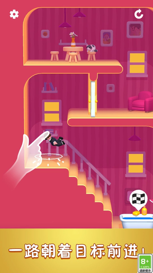 3、不同场景下的移动挑战各有差异,按照指示引导你的角色尽情游玩。