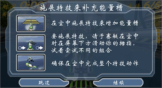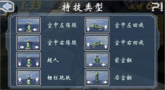 要释放特技动作,需在赛艇处于空中状态时,用拇指在屏幕下方进行滑动操作,不妨尝试多种不同的滑动组合方式。