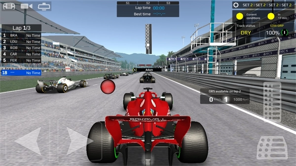 打开游戏界面后进入车库,依据屏幕上呈现的赛车手基础信息(如参赛场次等),点击开始比赛前往现场,通过操控按键进行模拟驾驶。