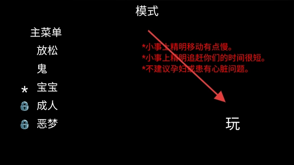 完成语言设置后,在模式选择界面选定难度(比如“宝宝”“成人”“恶梦”这几个选项),点击【玩】按钮,就能开启恐怖冒险的流程了。