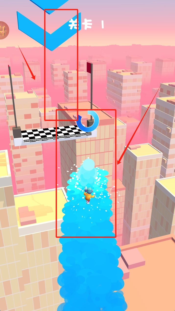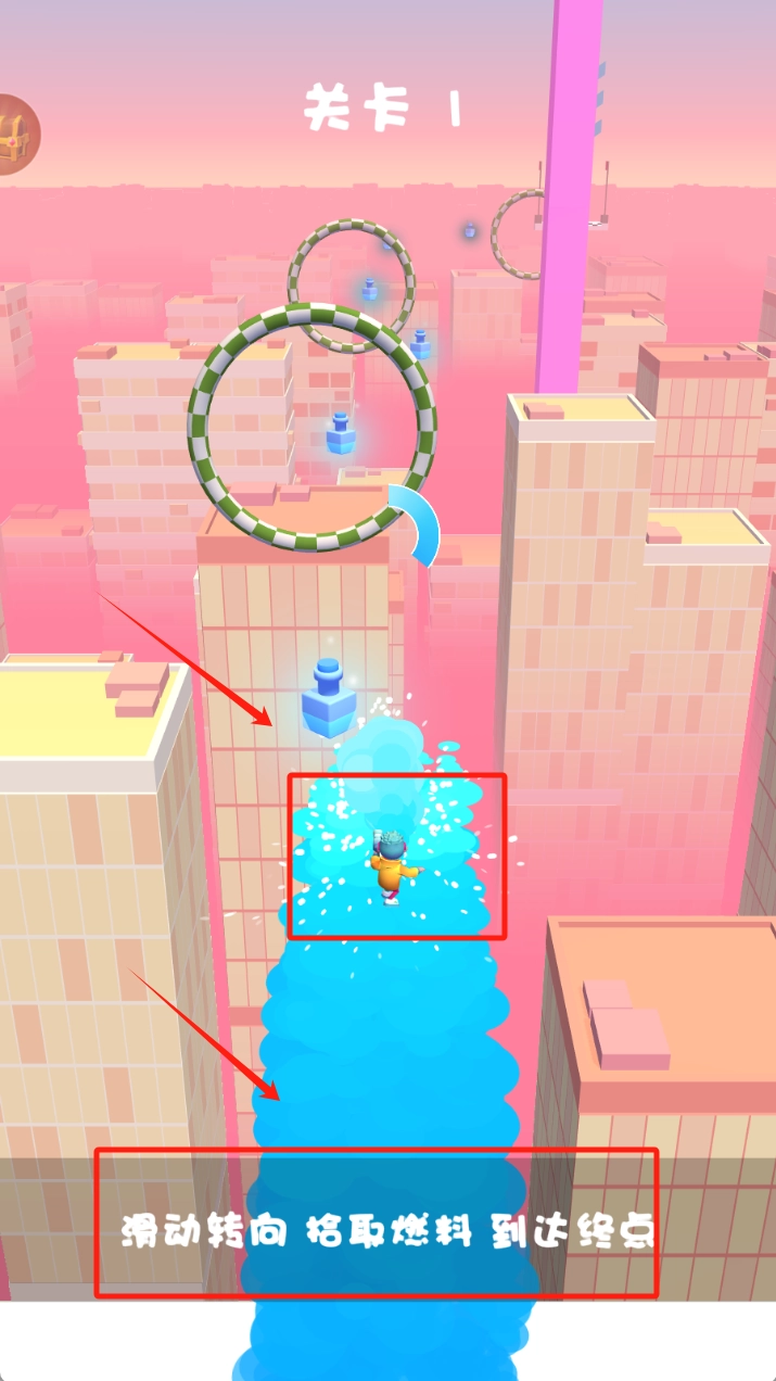 控制角色沿着蓝色水流的路径前行,留意上方的关卡1提示,躲开障碍物,收集路上的道具,背景是粉色的城市景观。