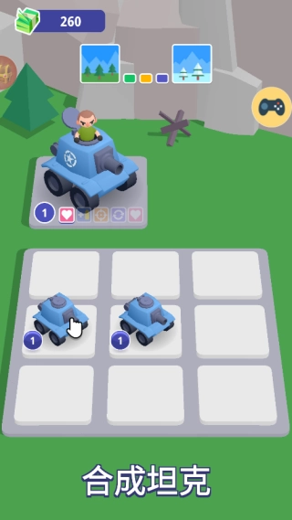 1、在关卡准备阶段,你可以购买坦克,相同坦克进行合并升级,获得更强高阶坦克。