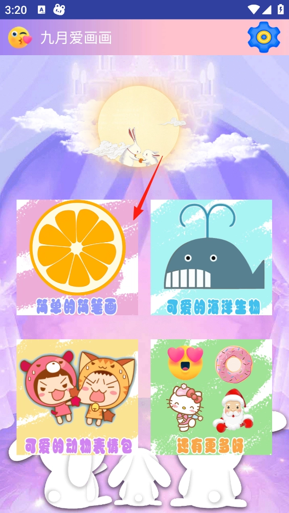 在九月“爱画画”主题的选择页面上,陈列着各类绘画分类卡片。点击“简单简笔画”卡片后,即可进入对应的绘画场景。场景里,梦幻般的背景能为创作增添氛围,同时还能获取该类别下的绘画素材与模板。