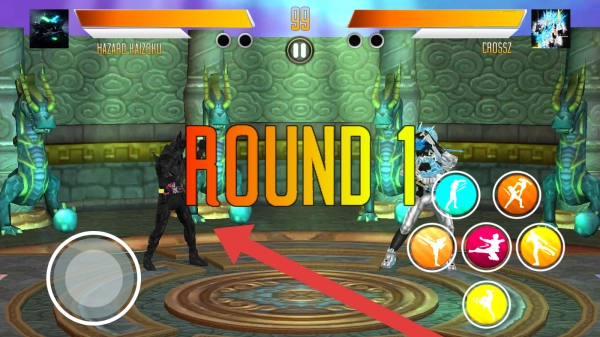 现在处于ROUND1第一回合,屏幕上呈现出血条、技能按键,背景是带有龙形装饰的格斗场景。
