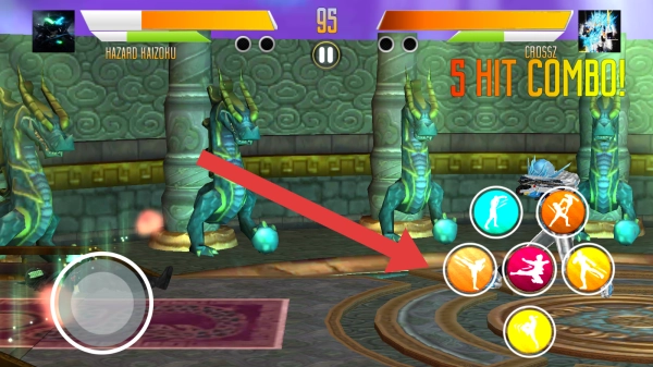 屏幕上显示着95的血量数值、“5HITCOMBO!5连击”的提示,再加上清晰的技能按键布局,以及背景里的龙形装饰与特色场景建筑,共同营造出紧张激烈的格斗对战氛围。