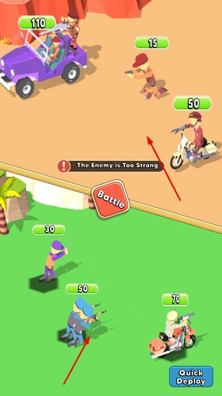 合并士兵以增强战斗力,派遣队伍投入战斗,在战场上对抗敌人,像紫色吉普上的小兵、摩托兵这类,要留意敌方强度的提示信息。