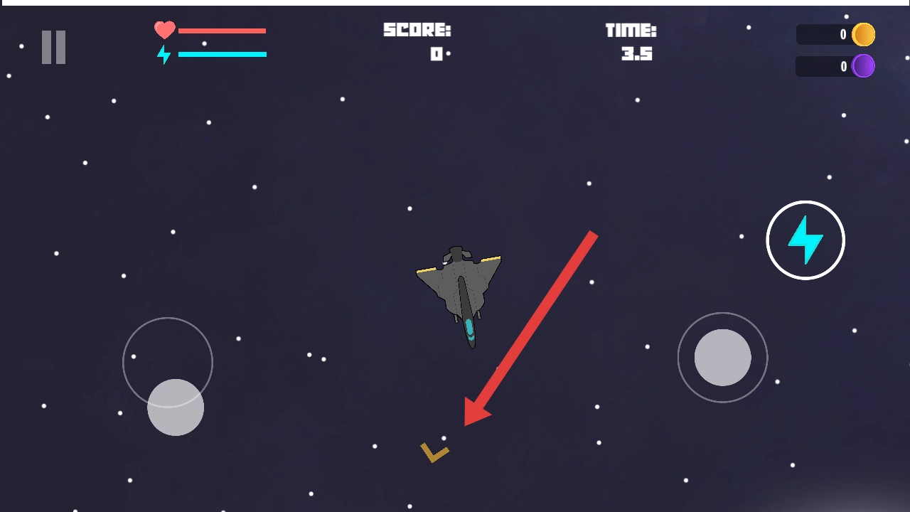 在游戏里,你得通过操控左边的虚拟摇杆来调整战机的飞行方向,然后驾驶战机朝着黄色的引导标记飞去。