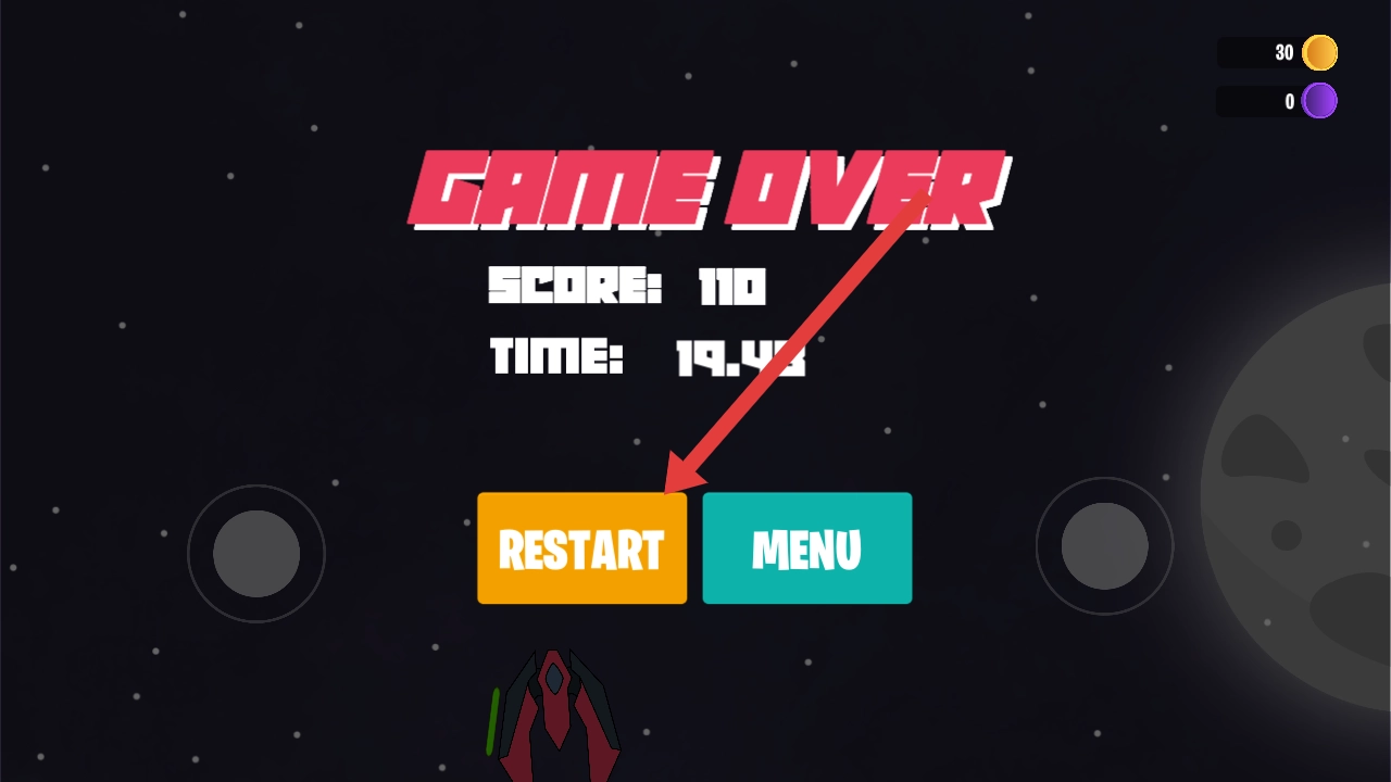 当我方战机被敌方攻击至血量耗尽导致游戏失败后,点击橙色的RESTART按钮,即可重新开启该关卡,继续挑战以获取更高分数。