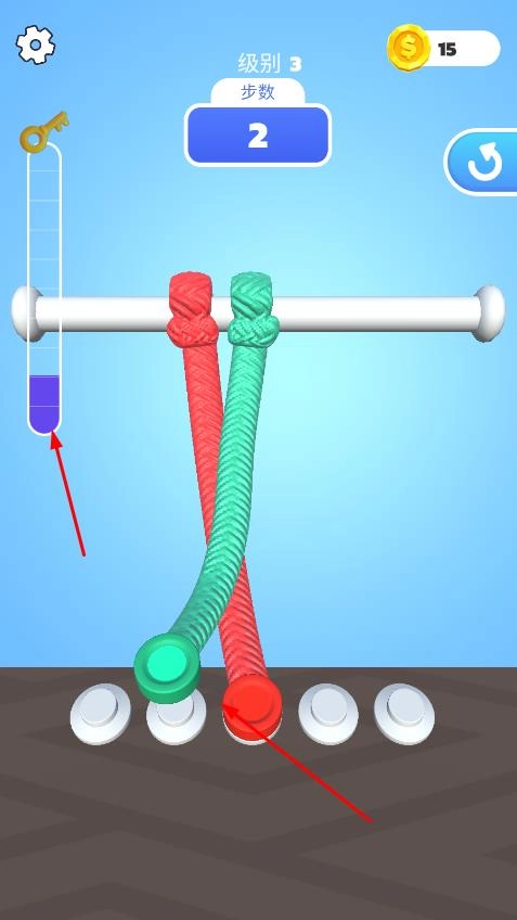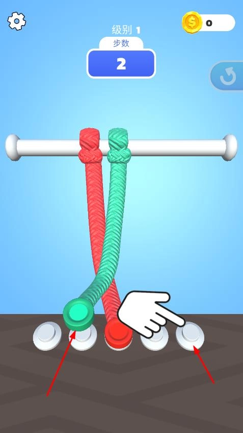 在第1关,拖动彩绳的末端,按照指定步数移动到对应颜色的卡扣处。