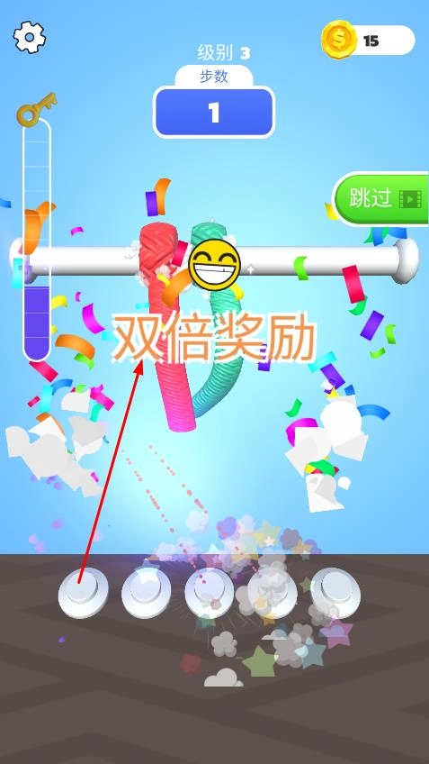 成功解开绳子后,会触发双倍奖励等反馈机制,获得金币奖励,之后可以选择点击跳过或继续,去挑战更高难度的关卡。