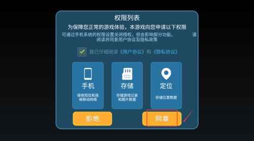 首次启动游戏时,需要先阅读用户协议,点击确认按钮后即可进入游戏主界面。