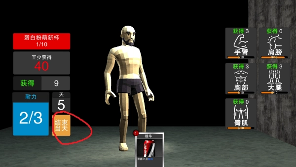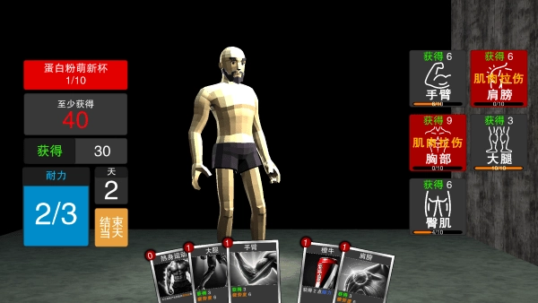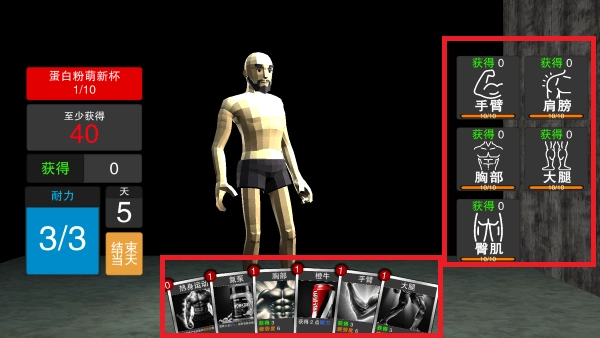 你能看到下方摆放着锻炼卡牌,右侧则显示着你各个锻炼部位对应的数值,注意别把它们都消耗完了。