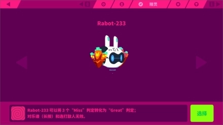 Rabot-233 能够把5个“Miss”判定转变为“Great”判定,此效果对乐谱以及长按敌人不适用。