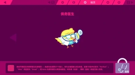 节奏医生里的佩吉医生变身为精灵啦——每当累计成功击退7个敌人,就会给主角回复2点生命值,而且第七次命中肯定是“Perfect”;“Miss”判定会变成“Great”;要是遇到音符或者红心类的Note就会自动接住。不过这个效果对乐谱(长按)、障碍(齿轮)还有连打敌人是没用的哦。