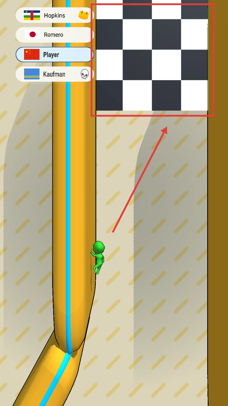 然后继续向上跳跃前进,冲向黑白格子的终点线,努力超越其他玩家,争取在比赛中获得更靠前的名次。