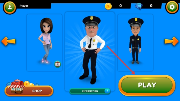 在主界面选择警察角色,点击PLAY按钮进入关卡选择页面,挑选绿色的1号关卡,即可开启城市跑酷的挑战流程。