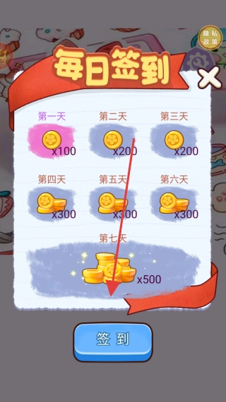 游戏内设有每日签到活动,连续签到的天数越长,所能获取的金币奖励就越丰厚。首次签到(即第一天)可获得100金币,累计签到至第七天则能领取500金币,只需点击签到按钮,就能拿到当日对应的奖励。