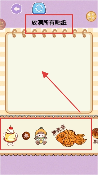 在游戏的贴纸玩法里,界面会提示要把所有贴纸都放满,你得把下方像鲷鱼烧这类的贴纸,拖动到上方的空白处,一直到把所有位置都填满,这样才算完成这个玩法的任务。