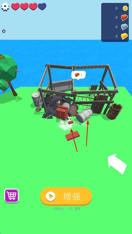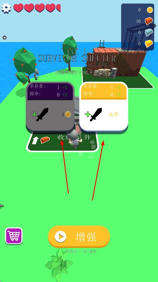 “建造升级”,用砖块搭建房屋,升级庇护所,增加幸存者数量、提升掠夺能力,强化生存实力。