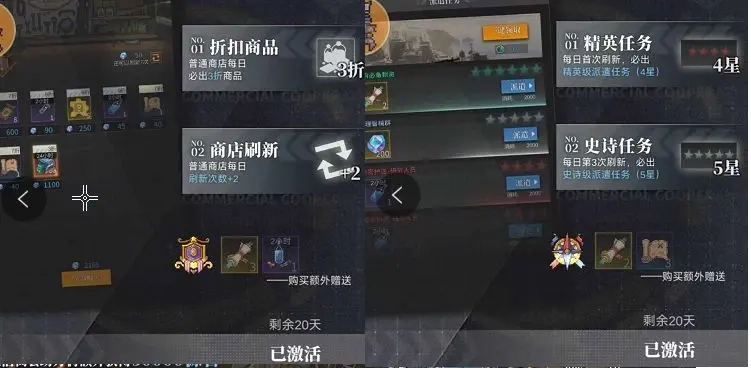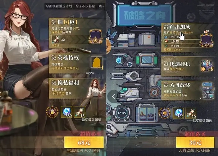 接下来是破吓跑破晓之舟和黎明之光,资源额外产出提升20%、快速挂机次数增加8次、招募券每抽10次返还1次。我个人认为,对于打算长期游玩的舰长来说,这是很有必要入手的。购买后还能免费额外获得一个嫦娥角色,每天可以多领取400源石,30天下来总共就是12000源石,怎么算都不亏。