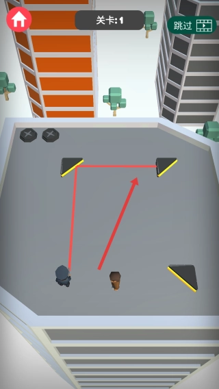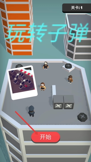 关卡启动步骤:点击“开始”按钮,进入“关卡1”;在该关卡中,你需要操控黑衣角色,并在屋顶场景中进行布局。