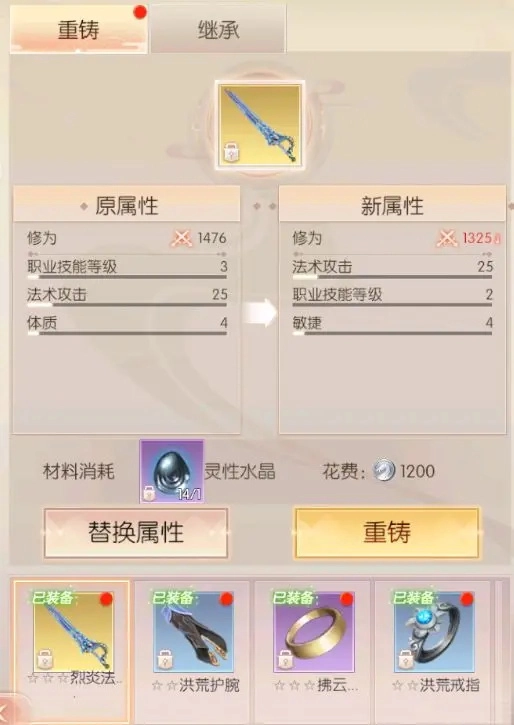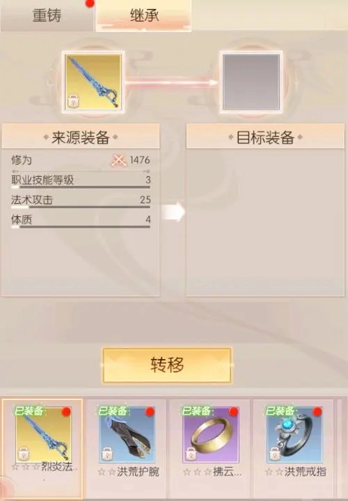 和精炼系统类似,重铸同样具备继承机制。玩家能够借助重铸继承功能,把来源装备的附加属性转移到目标装备上,而来源装备的附加属性会随之消失。进行重铸继承时,会依据装备的等级与品质消耗相应数量的继承石,并且重铸的属性仅能向品质更优、等级更高的装备进行继承。