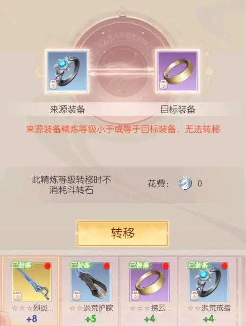当来源装备的精炼等级不超过12级时,进行精炼转移无需消耗任何道具;若精炼等级在12级以上,则精炼转移过程中需要消耗斗转石。