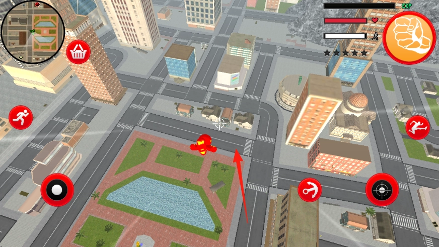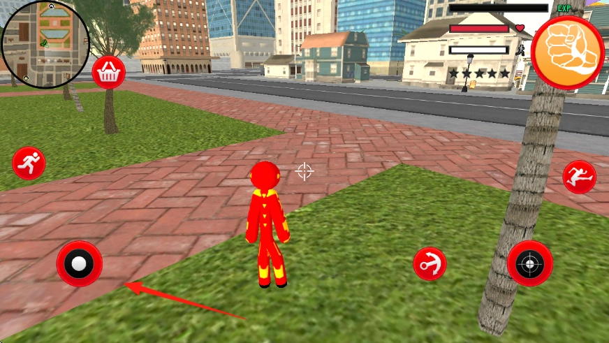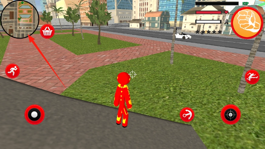请留意左上角的小地图,按照箭头所指的方向,控制那个有着钢铁侠外观的红色火柴人在城市里移动。
