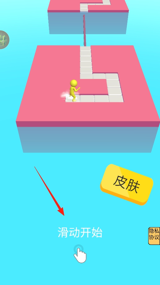 进入游戏准备界面,映入眼帘的是黄色小人站在粉色平台上。想要开启闯关之旅,只需用手指在开始区域滑动,小人便会沿着阶梯路径奔跑起来,正式开启收集冒险。此外,还可以点击皮肤按钮,更换各种好看的外观。