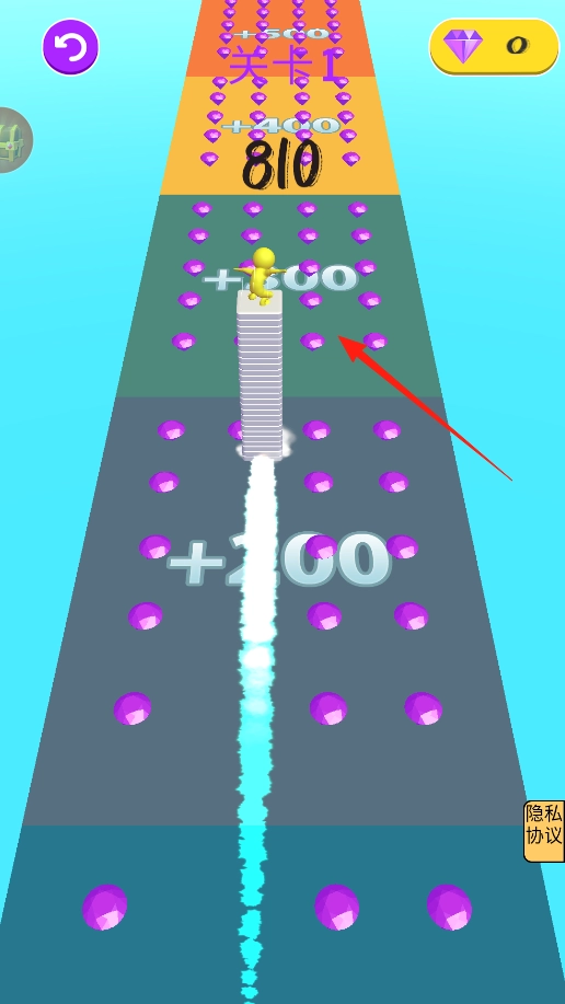 小人开始奔跑后,会在彩色跑道上收集紫色宝石,沿途还有加分道具。你可以通过左右滑动屏幕来控制小人的移动方向,要注意避开跑道上的缺口,尽量多拾取宝石和加分项,这样能让小人叠起的方块更高,从而顺利通过这一关卡。