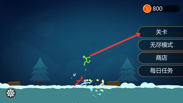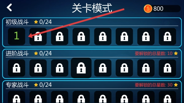 在关卡模式界面,根据箭头提示选择初级战斗分类下的1号关卡,点击进入该关卡后即可开启火柴人战斗任务。
